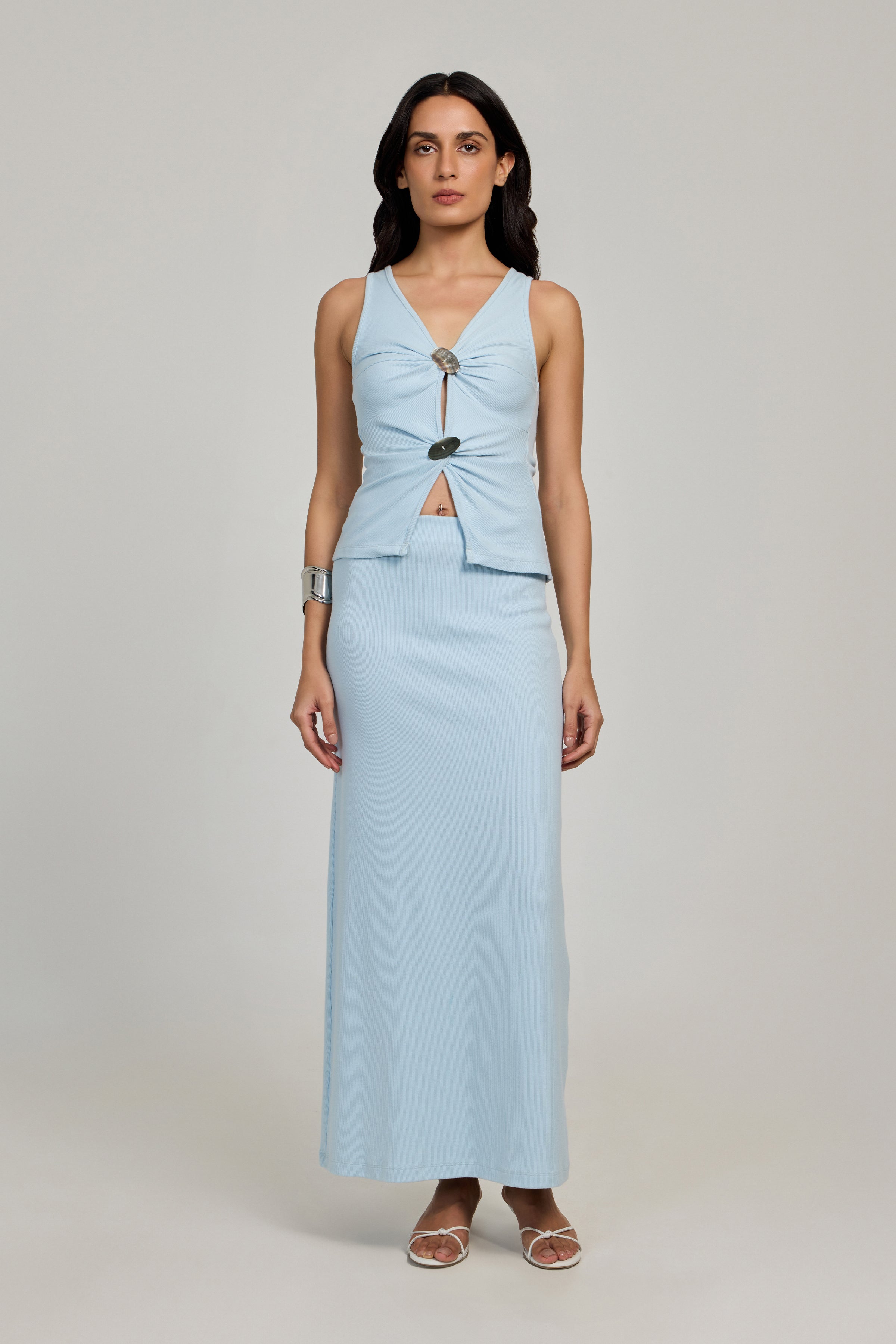 - Composition: 97% cotton 3% elastane- Unlined- Sleeveless- Shell button detail on centre front- Cut out detail in centre front- Hip length- Slim fit